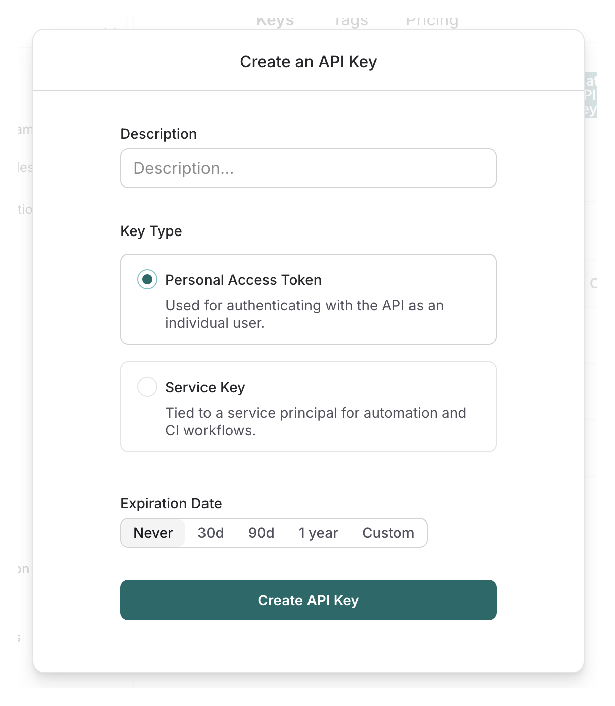Read more about the differences between Service Keys and Personal Access Tokens under admin concepts