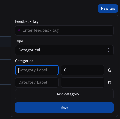 For categorical feedback, you can enter a feedback tag name, then add a list of categories, each category mapping to a score. When you provide feedback, you can select one of these categories as the feedback score.