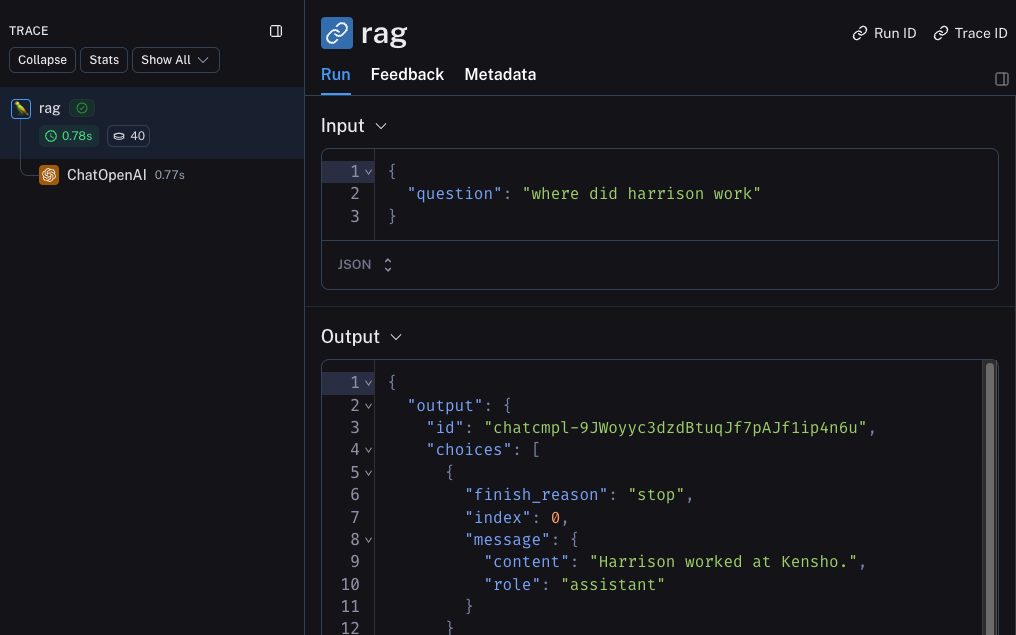 This will produce a trace of just the OpenAI call in LangSmith's default tracing project. It should look something like this.