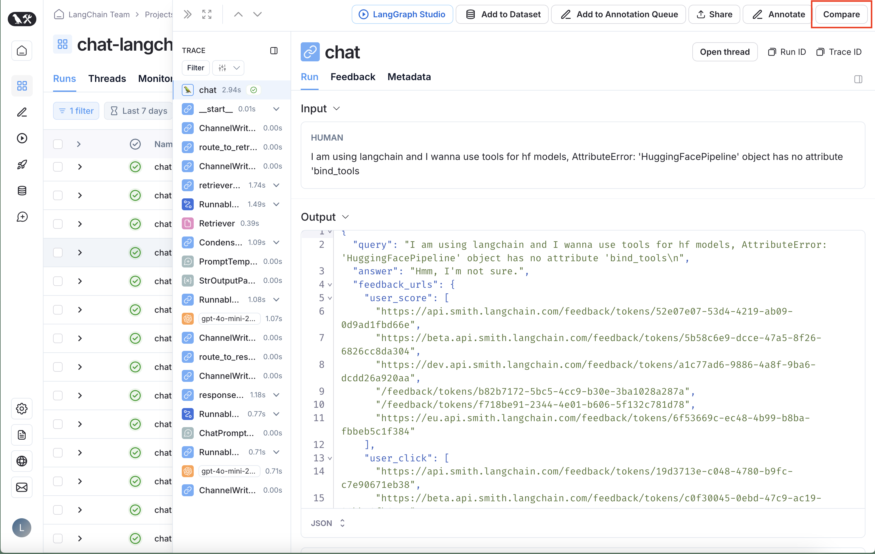 To compare traces, click on the Compare button in the upper right hand side of any trace view.