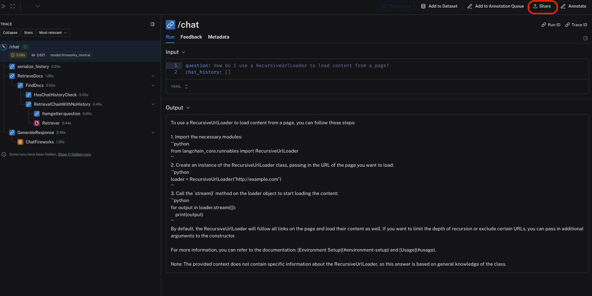 Sharing a trace publicly will make it accessible to anyone with the link. Make sure you're not sharing sensitive information.