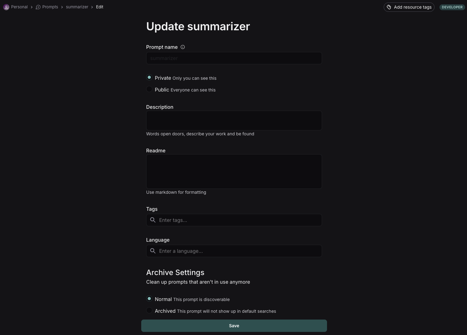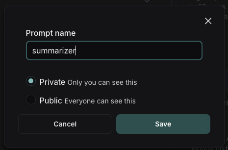 To save your prompt, click the "Save" button, name your prompt, and decide if you want it to be "private" or "public". Private prompts are only visible to your workspace, while public prompts are discoverable to anyone.