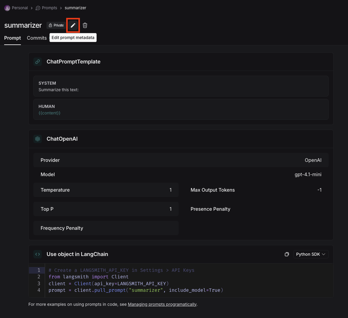 To add metadata to your prompt, click the prompt and then click the "Edit" pencil icon next to the name. This brings you to where you can add additional information about the prompt, including a description, a README, and use cases. For public prompts this information will be visible to anyone who views your prompt in the LangChain Hub.