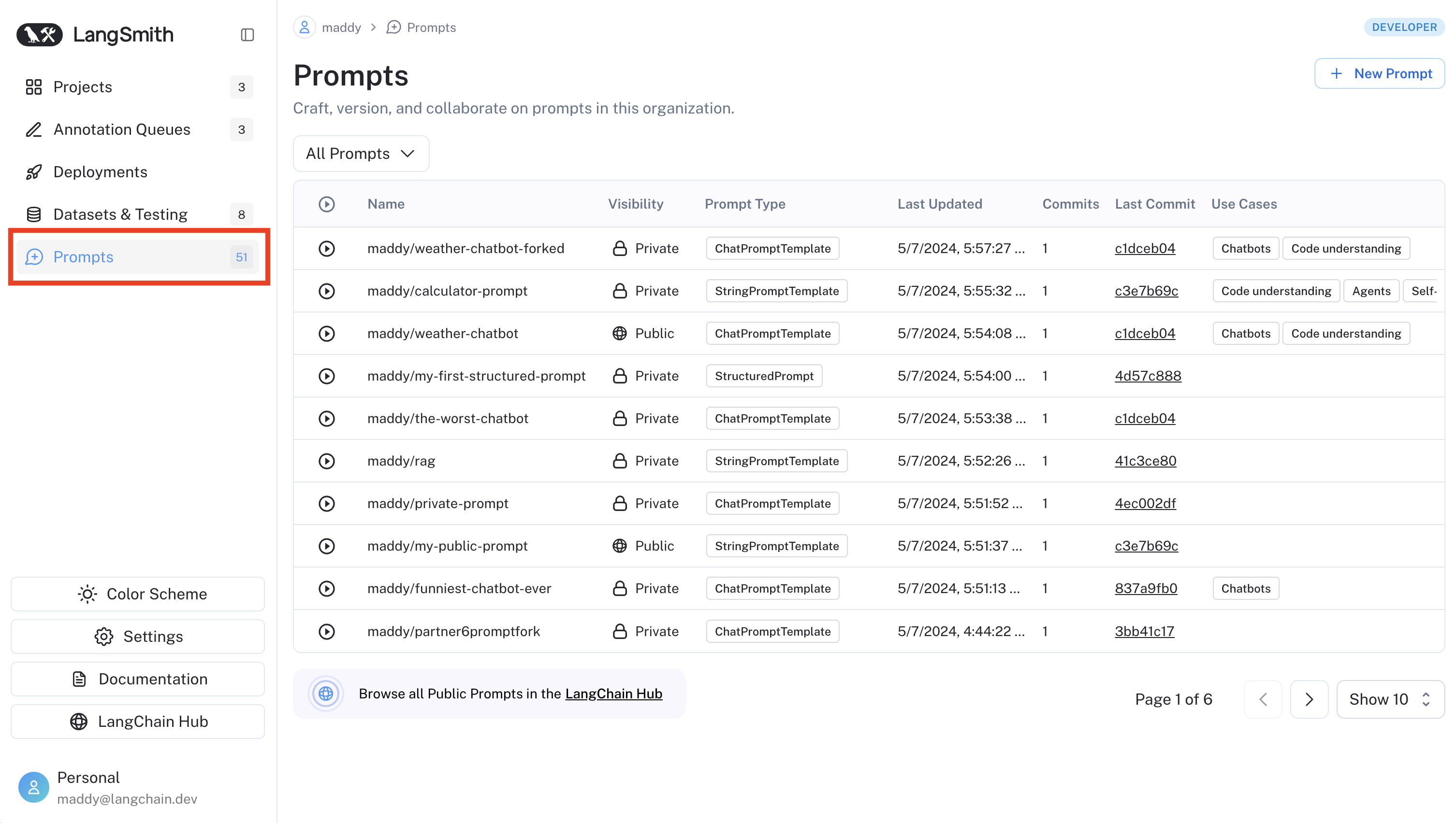 Here you'll find all of the publicly listed prompts in the LangChain Hub. You can search for prompts by name, handle, use cases, descriptions, or models. You can fork prompts to your personal organization, view the prompt's details, and run the prompt in the playground. You can pull any public prompt into your code using the SDK.