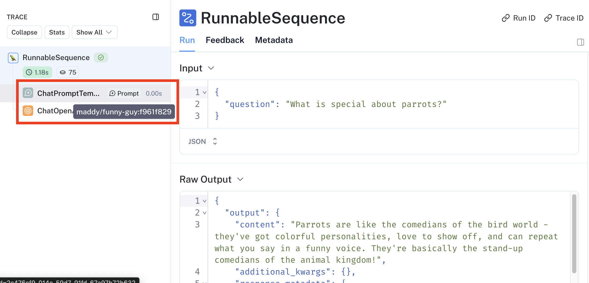 In the metadata of the run, you can see more details. Click on an individual prompt metadata value to filter your traces by that attribute. You can filter by prompt handle, prompt name, or prompt commit hash.